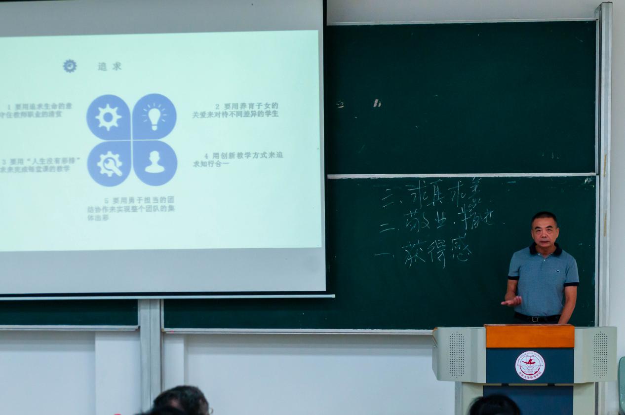 旅游学院陈江教授结合自身从教经历为全体教师传授从教以来的教书育人工作经验。他指出,好的老师首先要用追求生命的意义来坚守住我们的初心,爱岗敬业和奉献精神始终贯穿我们的一生。要用对养育子女的关爱来关爱学生,因材施教,仁爱执教。教师要严格要求学生,培养学生养成良好习惯。对待课堂,要用人生没有彩排的态度认真负责的完成每一堂课。最后他强调,老师要不断完善自身修养和学术水平,要有担当团结协作精神,培养好学生创新和发散思维。