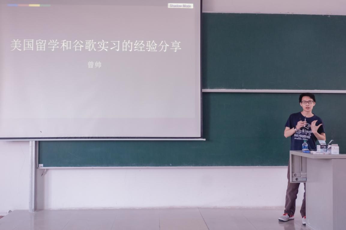 在这次交流会上,曾帅分享了在美留学期间的学习生活和在谷歌公司的实习经历。他从计算机学科和其他学科差异、国内外教育和生活方式等方面,重点围绕课程安排、考试机制、团队合作以及行业发展前景进行了比较全面的介绍,并结合自身亲身的留学经历,帮助现场的同学们解答了关于出国学习、工作和生活等各类问题。 在随后的互动环节中,同学们积极提问,曾帅也耐心地为大家答疑解惑。