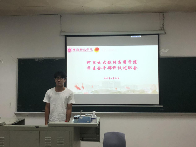图1 阿里云大数据应用学院学生会生活部副部长莫银龙述职现场