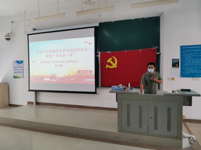 为深入贯彻落实珠海科技学院《关于做好2022年秋季学期二级学院党组织书记、院长上第一堂思想政治理论课工作的通知》精神,阿里云大数据应用学院高度重视,迅速响应落实,把院长上思想政治理论课作为抓好大学生思想政治教育,履行意识形态工作责任的重要举措。2022年9月6日,阿里云大数据应用学院院长吕威教授在D202教室为数据科学与大数据技术专业的学生讲授了一堂以“深学细悟《习近平谈治国理政》第四卷 坚持不懈用马克思主义中国化时代化的最新成果指导实践”为主题的思想政治理论课。本次思想政治理论课由阿里云大数据应用学院学生工作办公室主任高俊晗主持,学院全体辅导员和2020级全体学生一同参与学习。