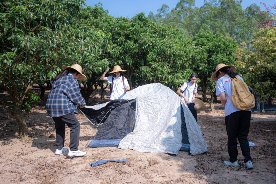 在任课教师的指导下,学生们以四人为一组,学习要点、分工合作,迅速投入到帐篷搭建的实操中。田野间,一组组学生相互配合,除草、清理场地、撑杆、铺布、固定,最终向老师展示搭建成果并接受稳定性检验。整个过程不仅锻炼了学生的动手能力,更将专业技能、劳动素养与团队精神的培养融为一体,生动展现了跨学科劳动教育的真实样态。